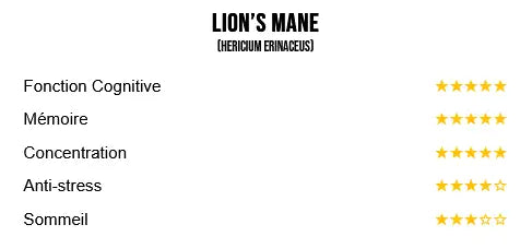 Riche en héricénones et érinacines — de petites molécules qui stimulent la production de NGF (facteur de croissance des nerfs), une protéine essentielle à la régénération neuronale — et en polysaccharides, bêta-glucanes & antioxydants, il améliore la cognition, la mémoire , la concentration, protège les cellules cérébrales, et réduit l’anxiété tout en favorisant un sommeil réparateur.