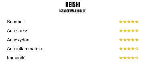 Riche en acides triterpéniques et en bêta-glucanes, il agit comme adaptogène, aide à réduire le stress, améliore la qualité du sommeil et renforce les défenses immunitaires en stimulant l’activité des macrophages et des cellules tueuses naturelles (NK).