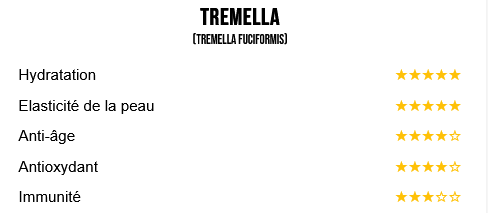 Riche en polysaccharides (glucuronoxylomannane) et en antioxydants naturels, le Tremella hydrate intensément la peau, améliore son élasticité et possède une action anti-âge reconnue grâce à :
