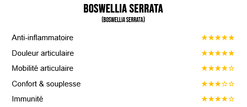 - Boswellia serrata (résine indienne) : acide boswellique anti-inflammatoire, soulage les articulations.