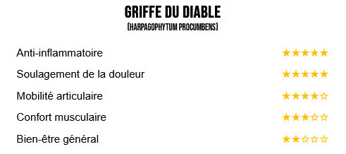 - Griffe du Diable (Harpagophytum procumbens) : racines sud-africaines riches en harpagoside, antalgique naturel.