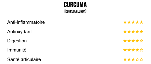 - Curcuma (Curcuma longa) : rhizome riche en curcumine, puissant antioxydant et digestif.