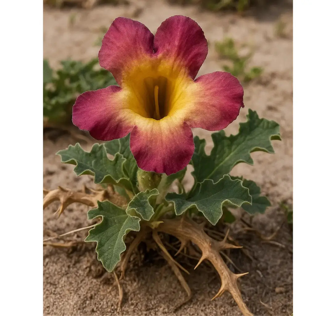 Originaire des déserts sableux d’Afrique australe, elle pousse sur sols arides grâce à ses racines tubéreuses.